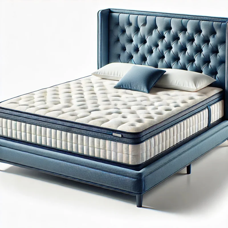 - A luxurious continental bed with a blue upholstered headboard and base. Designed with a triple-layered structure, including a sturdy foundation, high-quality mattress, and soft topper for ultimate comfort. Perfect for modern bedrooms.